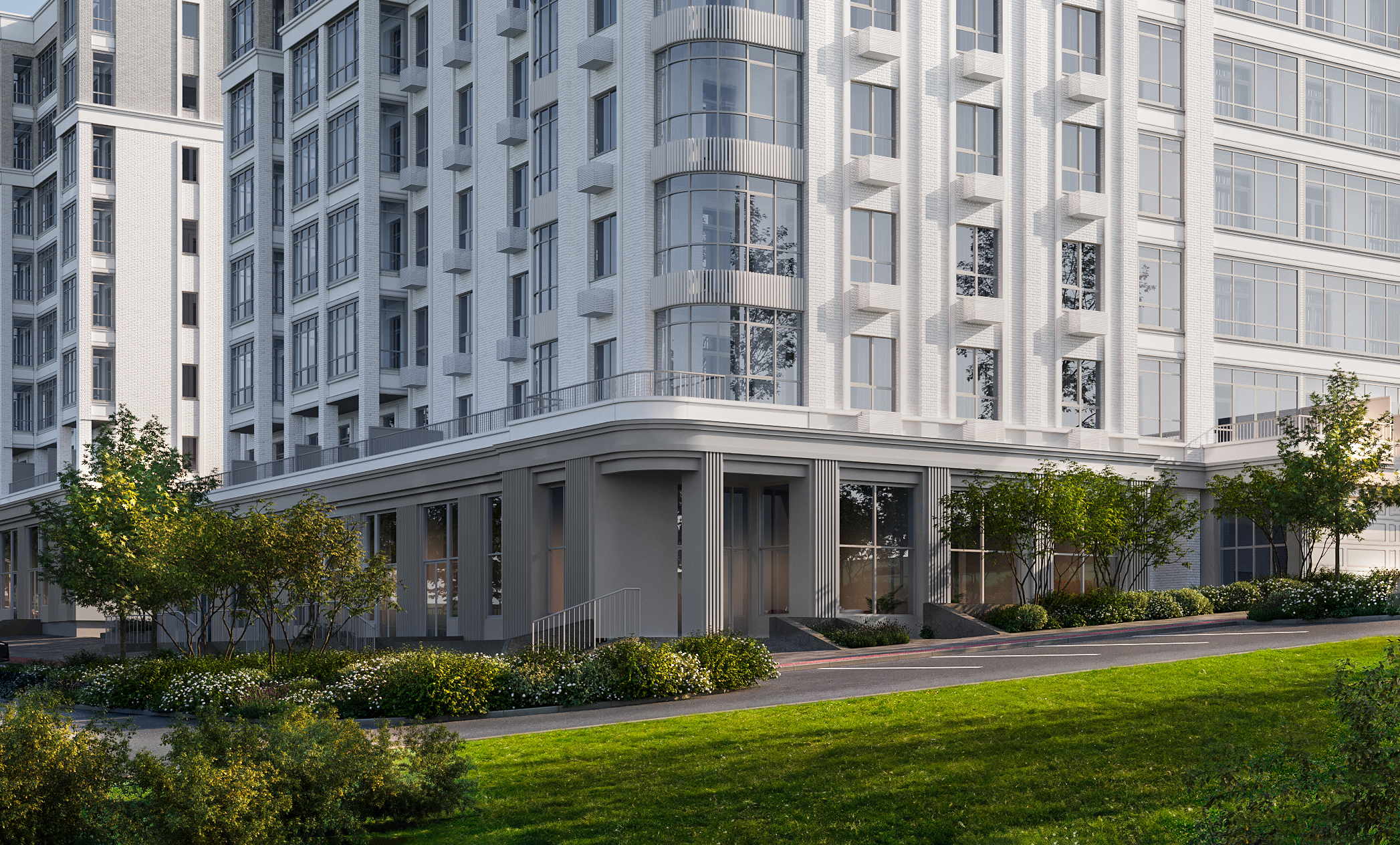 На следующей странице вы узнаете подробности про отличительную черту комплекса - благоустроенную территорию с ландшафтным дизайном и озеленением сразу большими деревьями.